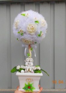 A beautiful topiary made of artificial flowers will be a good gift for children and adults. Such a composition will act as a decor during photo shoots. A decorative tree will decorate any interior, emphasize your chosen style.