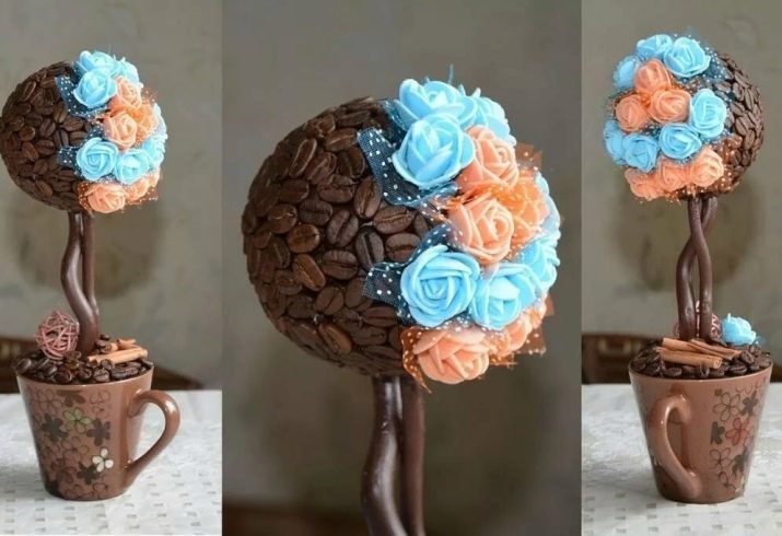 - Coffee tree with flowers. Such a topiary will be an unusual birthday present on March 8, it can be placed in the living room and in the sleeping room, such decorations are widely in demand in wedding decor.
