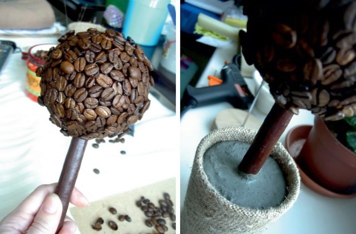 Some needlewomen prefer to coat their coffee trees with a mixture of coffee and PVA - this is not necessary, but such processing will make the craft more brilliant. Usually glue is mixed with water in equal proportions and pour instant coffee until then, until you get the desired color. You can add a little cinnamon and cocoa to this mixture - in this case the topiary will turn out to be even more fragrant and fill the house with an atmosphere of family warmth and coziness.