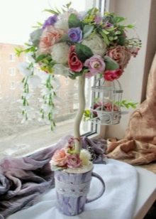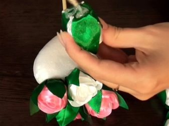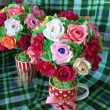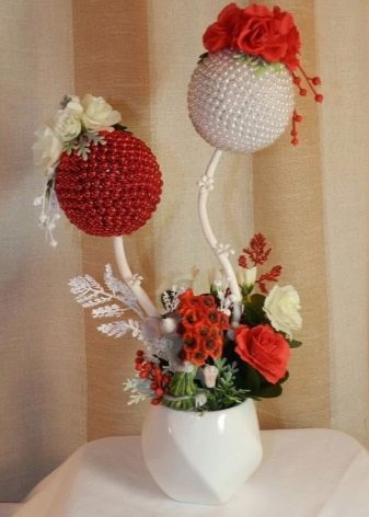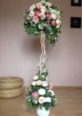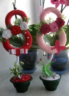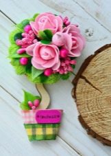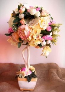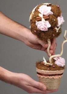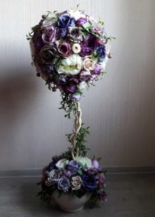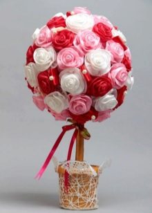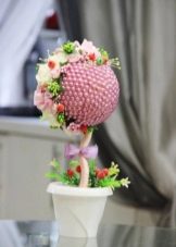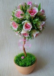 Flowers from ribbons and fabrics will help to add color to the topiary; you can use ready-made floral arrangements - rest assured, all female representatives will be delighted with such a gift.