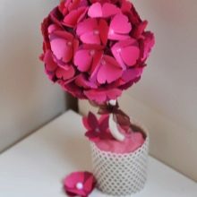 There are many different options for decorating a topiary as a gift on March 8. Novice craftswomen most often use corrugated paper, from which beautiful flowers are made. Trees can be created from beads, beads, satin ribbons, fabric, sisal, threads and many other improvised materials are used - imagination is limited only by the materials available.