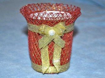 Any topiary needs a cache-pot. The easiest way is to use a flower pot for this - it is painted in the theme corresponding to the upcoming event. For small trees, you can use a beautiful glass, cup or even a jar. The easiest way to decorate the flowerpots is with a floral grid, and a bow is glued on top.