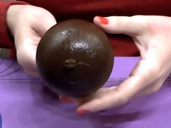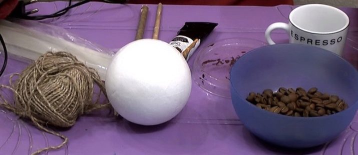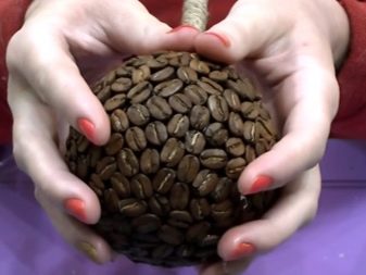Hot glue is spotted on the foam ball and coffee beans are fixed. Try to fix the details as close as possible to each other so that the base does not shine through the grains. Experienced needlewomen lay grains alternately convex and smooth side up. In those places where gaps will be noticeable, you can stick coffee beans in two layers.