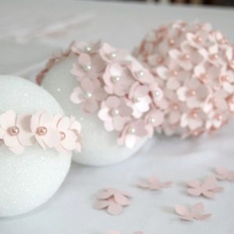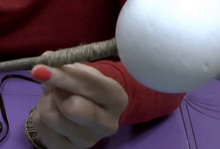 After the blanks are done, you can proceed directly to decorating the crown of your tree. To begin with, on the surface of the base ball, with an awl, make small holes and insert the roses received into them, securing them to the glue gun.