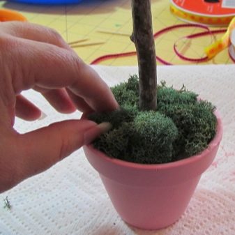 To design the trunk, jute is used - the branch is tightly twisted with braid, and so that it does not unwind during operation, each layer is coated with PVA glue, and the tip is fixed to the glue gun or using a stapler. If you used a thick wire to make the trunk, it can be slightly bent - in this case the tree will look more natural and realistic.