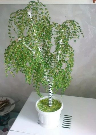 For beginners, it is best to use the technique of making coral - it is the simplest and fastest. For the manufacture of topiary, it is necessary to fasten 2-4 dozens of wire cuts to the tree trunk - they will act as coral branches. The required amount of beads is planted on each, branches are formed in some areas and beads are strung on them again. These steps are repeated several times so that each subsequent branch is shorter than the previous one.