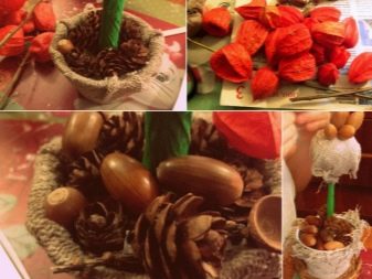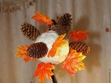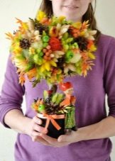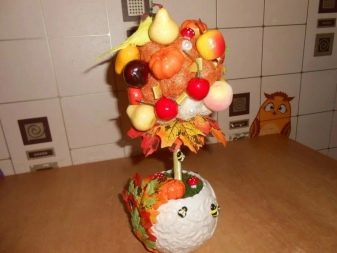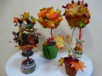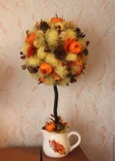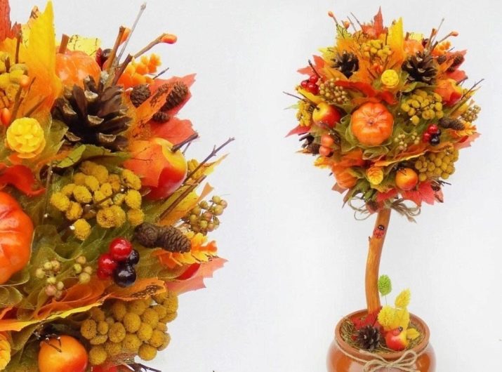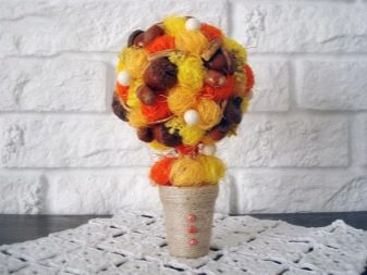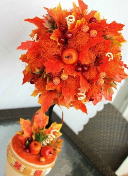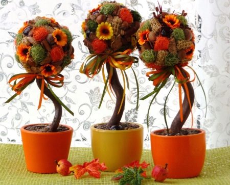 Any needlework involves the use of certain materials. Topiary in autumn theme can be made from leaves (real or artificial), berries, acorns and other objects that are associated with this charming time of year. You can also use various decorative elements, such as beads, fabric ribbons, figures and much more.