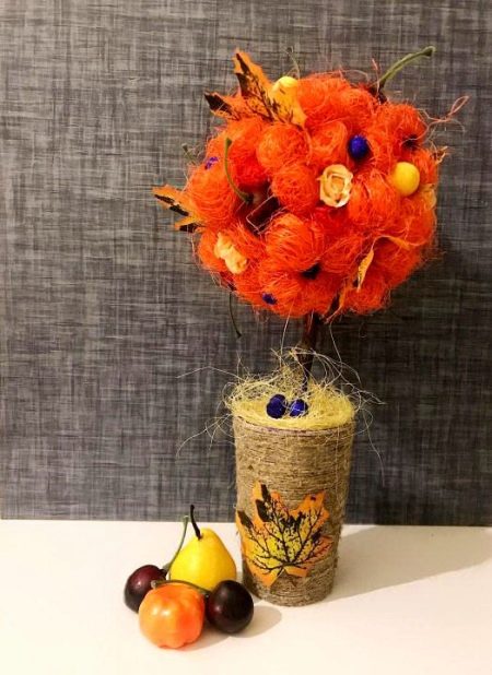 After making the topiary, you need to find a suitable place for its installation. It is worth noting that in this case there are no exact rules and prohibitions. In order for the craft to decorate the interior and please the eye, it is necessary to establish a “tree of happiness” in such a way that it is noticeable. You should also make sure that the autumn topiary will be in harmony with other objects in the decor.