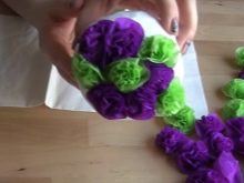 - Then you should take crepe paper. Paper strips must be folded in half to make a square, fold it four times and fasten. You can use a thread, or you can use a stapler. Cut the circles, and then form the petals and flowers of the desired shape.