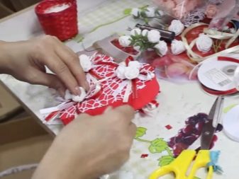 - Then we wrap the heart with a silk or satin ribbon of your favorite shade. Carefully fasten the tape in the most inconspicuous place. For these purposes, it is better to use hot glue. It is worth noting that some craftswomen sometimes make wrapping figures with ribbons before they connect to the trunk. To whom it is more convenient to work.