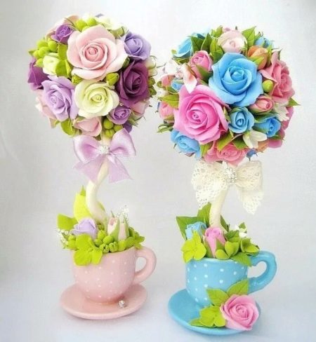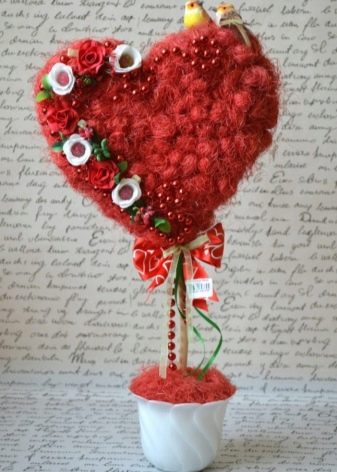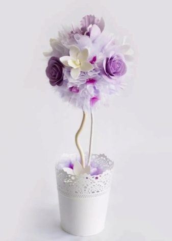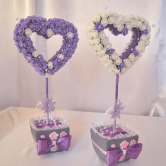 Topiary in the shape of a heart looks advantageous. And the topiary with flowers from foamiran look the most elegant, as a rule, their brides buy by reservation. If you have skills in working with foamiran, then repeating the topiary according to the general instructions and placing flowers on it will not be difficult.