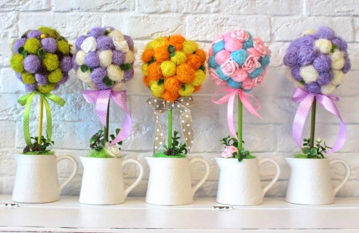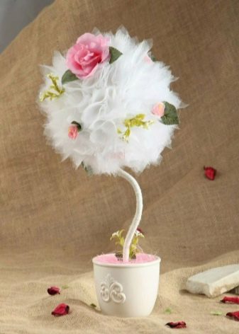 As a wedding topiary, trees with a lush crown of organza fungi are perfect. Such "trees of happiness" can also be done at home without any problems.