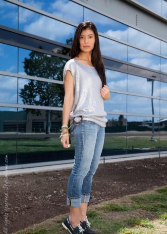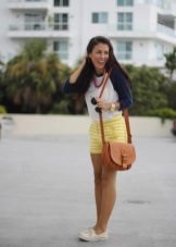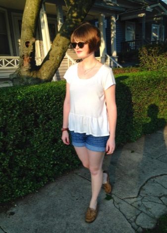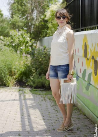 - An image in a sports style, emphasizing the dignity of a slim figure. Short denim shorts with lapels and a decorative belt will help emphasize slender, long legs and elastic buttocks.