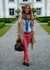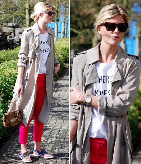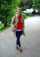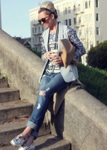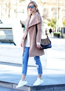 - An outfit filled with calm and characterized by incredible restraint. Despite the fact that ripped tight jeans are chosen as the bottom, the image does not cease to be less elegant. A stylish blouse and an elongated trench coat the color of coffee with milk did their job, adding a touch of sophistication to the outfit, as well as unobtrusive accessories.