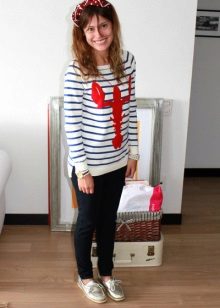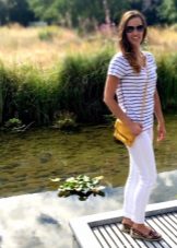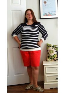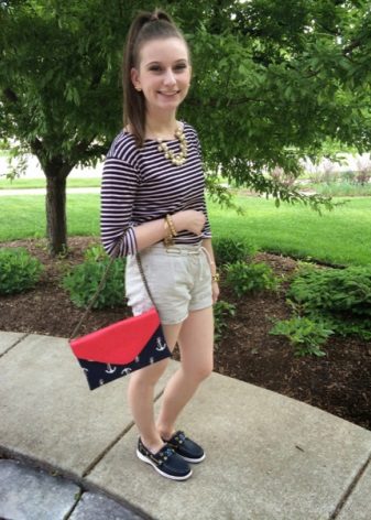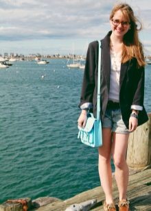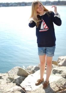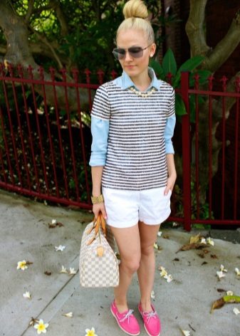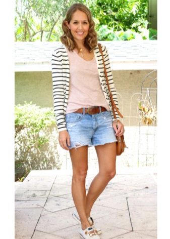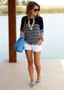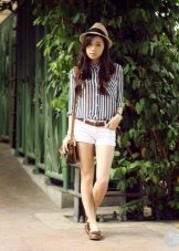 - An image suitable for rainy summer weather, diluting gray with bright colors. You will need blue slightly loose shorts with lapels and a white jacket of a straight cut with thin blue stripes - a combination in the best traditions of the marine style.