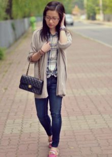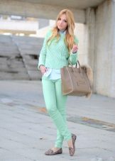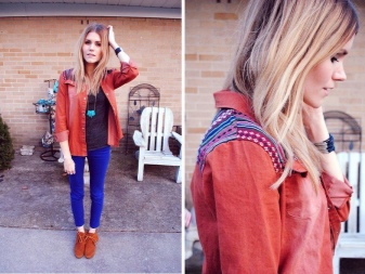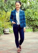 - A good outfit for a light autumn cool, adding a drop of paint to the gray rainy daily routine. Light jeans - boyfriends look great with a white shirt with a small floral print. This garment is complemented by a turquoise quilted jacket, which, incidentally, is two-sided and has an orange color inside.