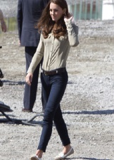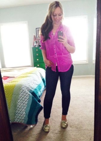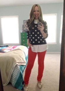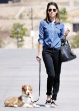 - An image that fits into the framework of a business style and any office dress code. Skinny black pants, length 7/8, will look great with a blue cotton shirt, decorated with a white "pea" print. The sleeves of the shirt can be tucked up, and the lower edge tucked inside the trousers.