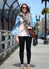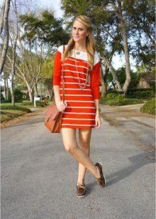 A large denim bag will serve as a very useful functional element, a black jacket - a cardigan will help in case of cooling, and the stunning light pink boat shoes will look great with short red socks.