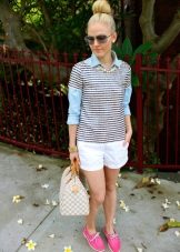 - A functional look in casual style will amaze others with a combination of unusual stylish details. This white polo shirt with blue breaks and a decorative pink collar looks great with cappuccino shorts.