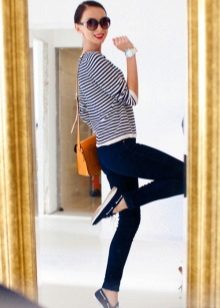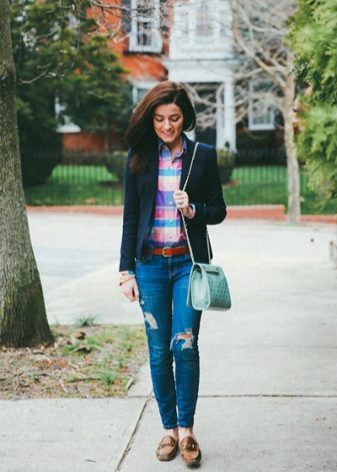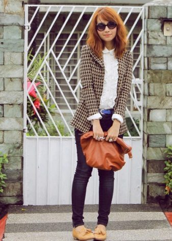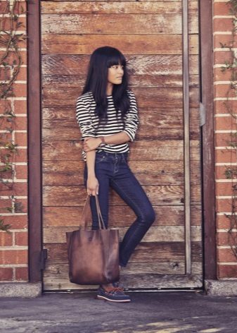 A worthy addition will be a large rectangular bag and stylish black boat shoes that look like elegant flat shoes.