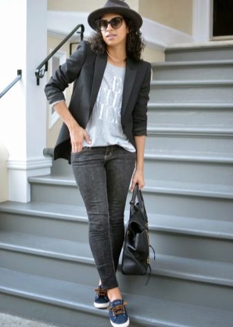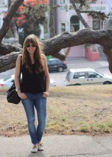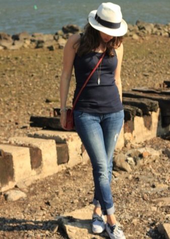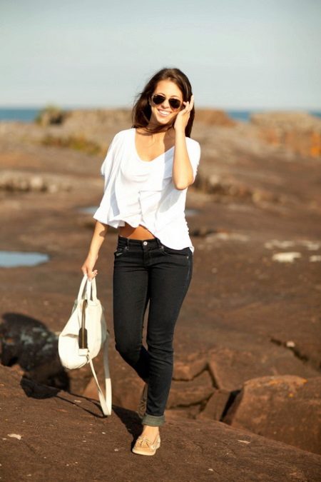 - Great walking or hiking outfit! For an active pastime, you need the most convenient things, which is why you should opt for functional black jeans of a skinny model with rather wide lapels, as well as a white loose t-shirt that is perfect for hot weather.