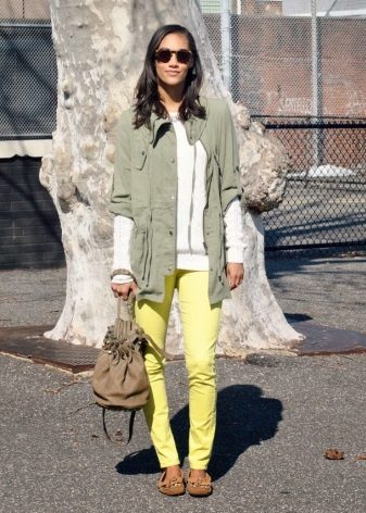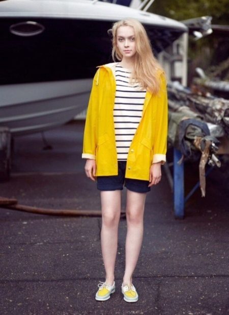 A yellow loose raincoat made of dense material will perfectly combine with white and yellow boatsiders, creating such a peculiar set.