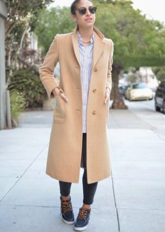 A stylish light brown bag of large sizes perfectly complements the outfit, and bronze boaters perfectly emphasize the style of its owner.