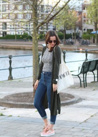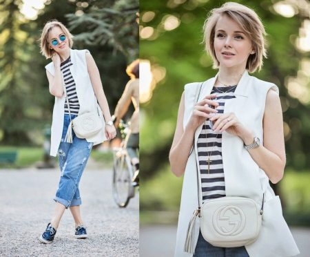 - A summer outfit suitable for lovers of an active lifestyle will surely amaze others! What could be more stylish than a combination of light denim breeches, vests and an elongated cardigan without sleeves made of jacket fabric.