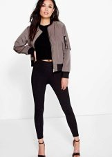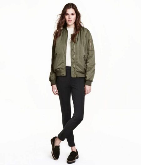 A classic army-style bomber jacket, dark-gray traggings and bare-foot loafers create the perfect casual look, appropriate both on the streets of metropolitan areas and in classrooms of large universities. The youth style does not appear flashy and piquant, but minimalist and focused on comfort and lightness.