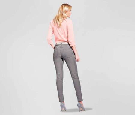 A delicate and beautiful image is formed due to the right color scheme - gray treggings in combination with gray stilettos make the legs visually longer, a belt of a lighter shade emphasizes the waist, and a pink top makes a winning emphasis on luxurious hair.