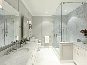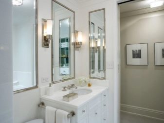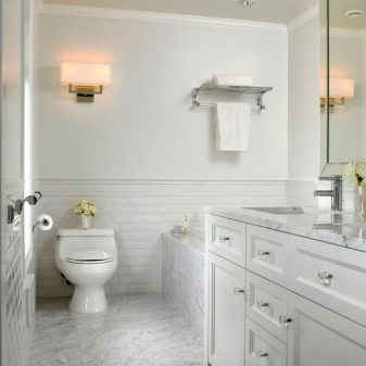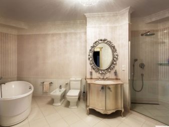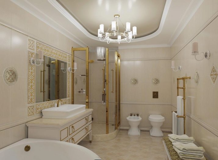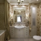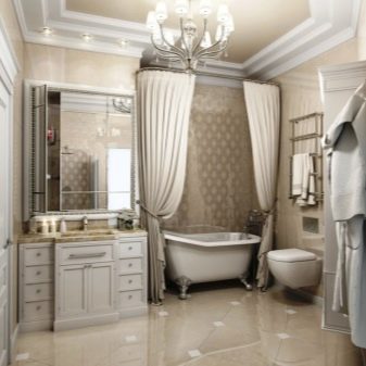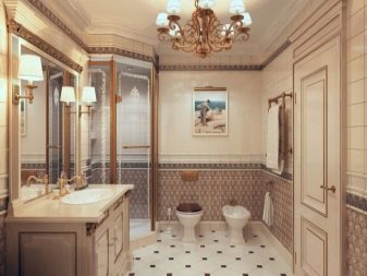 For classic and neoclassical interiors, milk, vanilla, ash, chocolate shades are suitable. Golden fittings in retro style make the interior aristocratic. Lighting is often realized using a small chandelier and graceful sconces in the area of the mirror. Appropriate the use of tiles that mimic marble.
