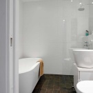 Whiteness, plenty of light and space are the features of Scandinavian comfort. The combination of glass, chromed metal and wood forms an expressive composition. Bath on the podium, double washbasin - everything is created here for relaxation.