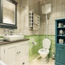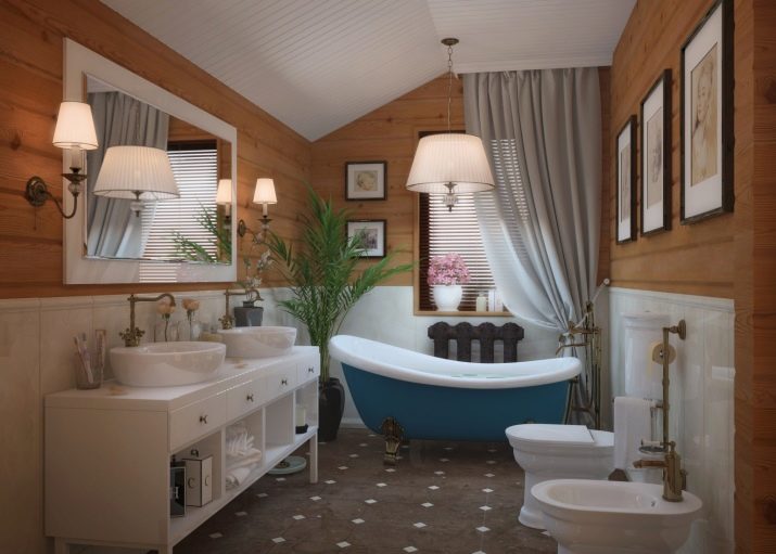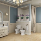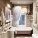 In this style, bathrooms in country cottages and country wooden houses are usually designed. “Sprayed” tones, floral patterns, textiles, wooden cabinets - all this creates an atmosphere of rustic comfort of past years. It is appropriate sconces in fabric lampshades (of course, in areas protected from water splashes), wicker laundry baskets, mirrors in vintage frames.