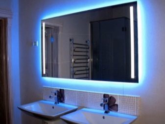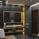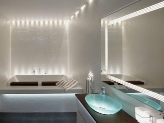 Even in a room with such a modest size, like a bathroom, You can not be limited to one central lamp. Even the backlighting integrated around the ceiling may not be enough. Necessary additionally illuminate the wash area. This can be a built-in backlight in the form of spots or LED strip on the mirror.