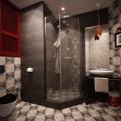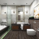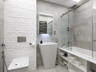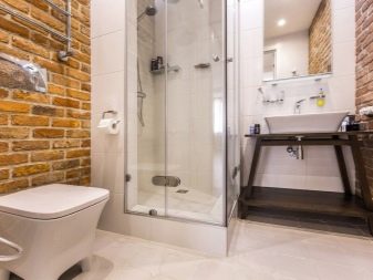 This brutal style involves dark colors, imitation of concrete, red brick, rusty metal. However, in a small room it is better to dilute the gloomy atmosphere with light tones. In order not to lose the mood of the design idea, you can combine brown and gray surfaces with snow-white large tiles or imitation of white brick. In mixed style permissible use of chrome faucets and fixtures, glass parts, modern white sanitary ware, light wood furniture.