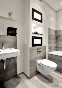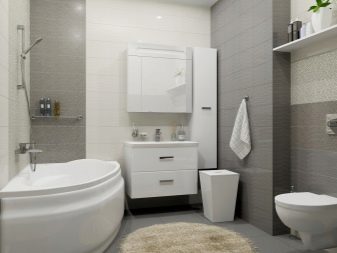 Moreover, the gray tile is very practical - on it stains from drops of water are completely invisible. The severity of the white-gray range can be softened with beige tones, for example, imitation wood.