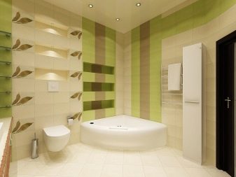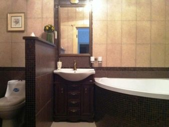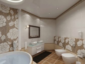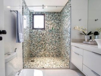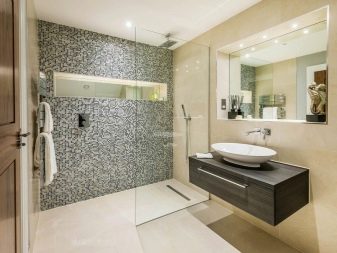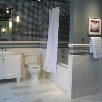 Professional designers often combine in the design of one room two types of ceramics. For example, mosaics are used to decorate the shower area. It allows you to easily and beautifully design any curved surface.