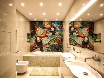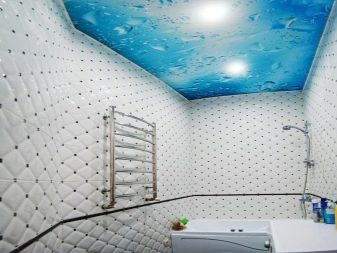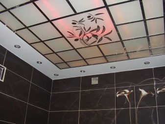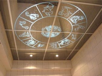 A rarely used, but incredibly beautiful and expensive option for finishing the ceiling in the bathroom - tempered glass plates. Material can be mirror, opaque, color. Stained glass windows and various photo images with built-in backlight look very impressive.
