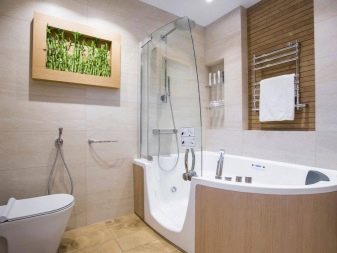 If there is not enough space, you can choose a compact bathtub. The main thing is not to forget about arranging shelves for washcloths, shampoos, gels and other hygiene products. As a fence, you can choose a glass partition with a rotary "wing".
