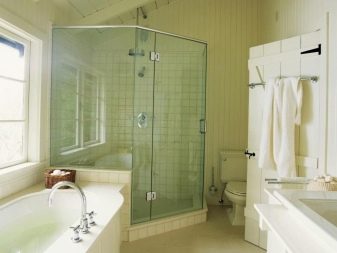 Glass helps to make the interior more light and airy. For the shower, you can use a transparent frameless fence, and for the bathroom - sliding or pivoting glass doors. If ordinary glass seems too boring to you, you can decorate it with a sandblasted pattern. Such surfaces look graceful and weightless.They do not overload the space, but become a worthy decoration of the interior (keep in mind that the design of the walls in this case should be calm).