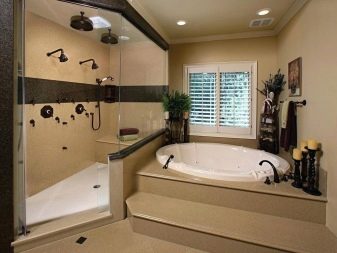 If there is a hydrobox with a roof, it is necessary to have spotlights built into the structure itself. If it is an open type model, a diffused ceiling lighting should be provided above this area. If you like to take a bath, It is advisable to provide a subdued lower light. In this case, the ceiling lights will not annoy with their brightness, and you can fully enjoy the rest.