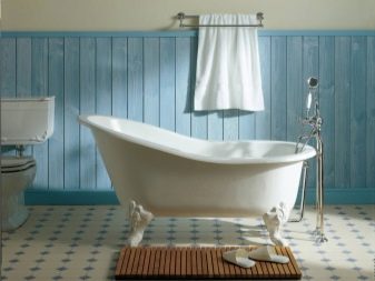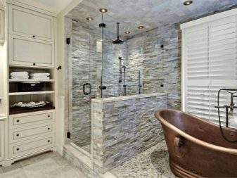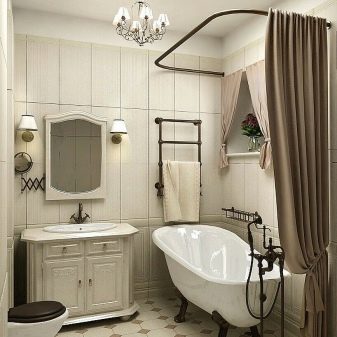 Accessories in such interiors imitate bronze, the bath usually has high legs. Here about the shower can not be considered. Installation is also not provided.