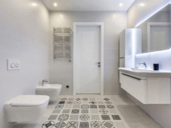 At the peak of popularity bulky tiles imitating wood, stone, concrete. Lamps are mainly built-in. It is possible to use overhead and attachments of a futuristic design.