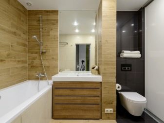 There is only one drawback. If the family has more than one person, difficulties may arise with the simultaneous use of two functionally important zones. The problem can be solved by establishing a small thin partition. So you get the opportunity to retire to any part of the bathroom, preserving the unity of space.