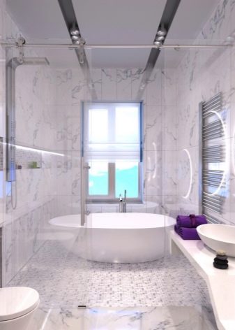 Often the best option is to position the bath along one of the short walls. Even if you have to take a model of a reduced size, the ergonomics of the room increases. If you place a bath and sink on the end walls, it will also visually increase the space.