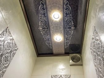 - A glossy stretch ceiling of black color may also look good in the toilet, but it is advisable to install it if the walls are finished with light materials. It can be a tile combining beige / white and gray colors. It is necessary to supplement the film on the ceiling with a sufficient number of built-in and spotlights.