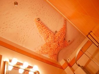 There are a lot of options with which image to decorate the ceiling in the toilet. Choose a specific option, starting from the color scheme, which sustains the interior of the bathroom, as well as its style.