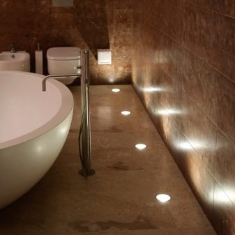 - Spotlights. Are applied in the conditions of a bathroom more often than other options. They are inexpensive and look aesthetically pleasing. For the bathroom, you should choose lamps that are distinguished by a high degree of protection against dampness and moisture. Such products are able to sufficiently illuminate the room and organically fit into a small space.