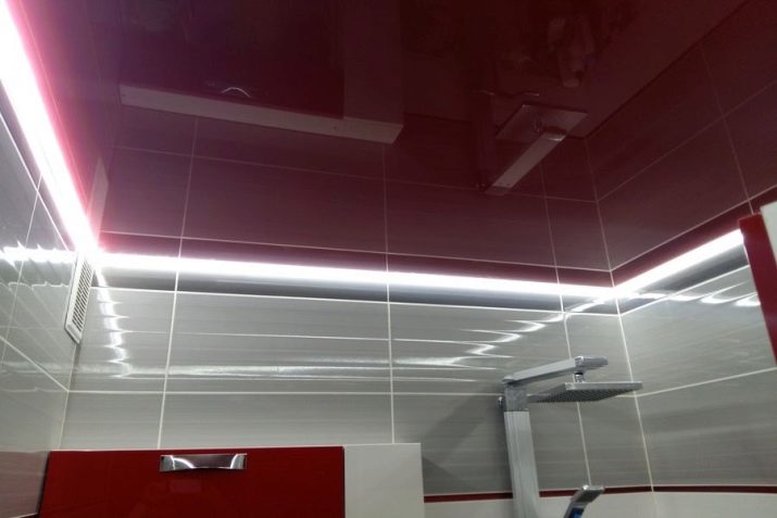 - The soaring stretch ceiling of a juicy dark red shade will look gorgeous in the toilet. Along the perimeter it is worth highlighting a white diode backlight.