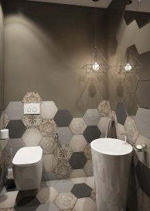 Combinations of tiles of different types look interesting. Actively used in the design of large-sized models, options of an unusual shape (for example, in the form of hexagons). Black and white or gray and white patchwork is allowed. The hog and mosaic have already become classics.